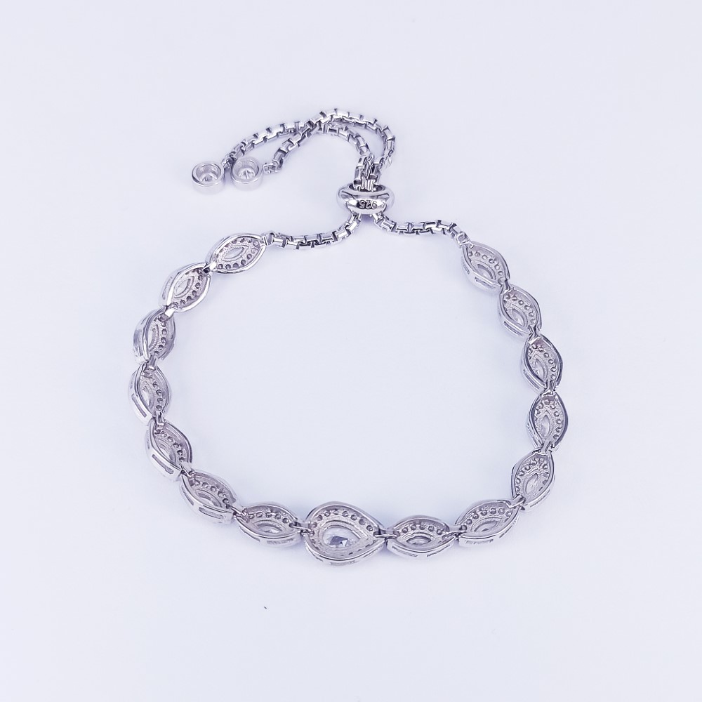 Marquise Halo Tennis Bracelet set with marquise and round shaped cubic zirconia, Manufactured in genuine sterling silver and electroplated with Rhodium. With adjustable fastener.