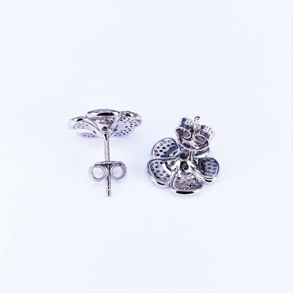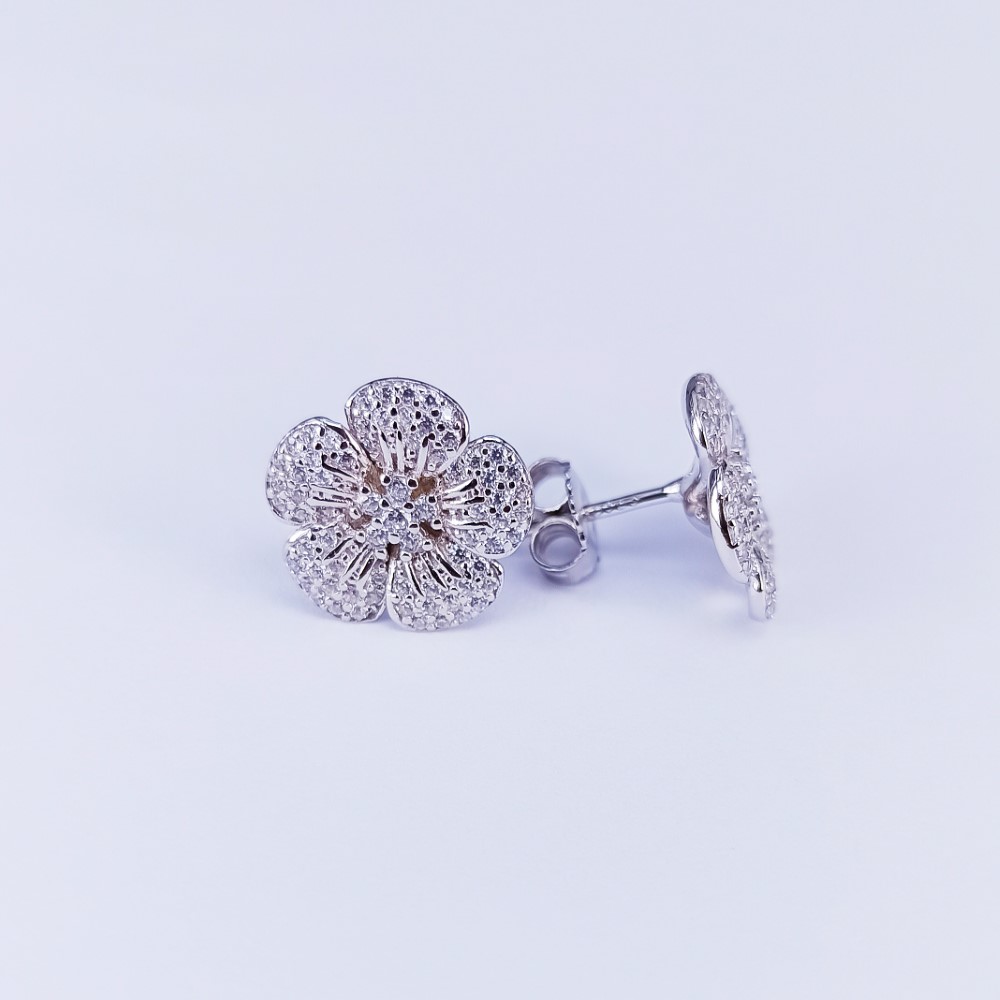 Daffodil shaped tops earrings manufactured in genuine Sterling Silver, studded with round shaped cubic zirconia set in Pavé style. Rhodium plated.