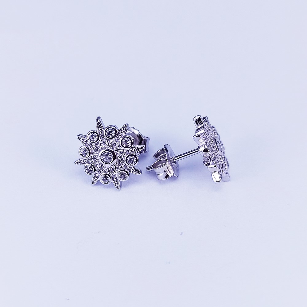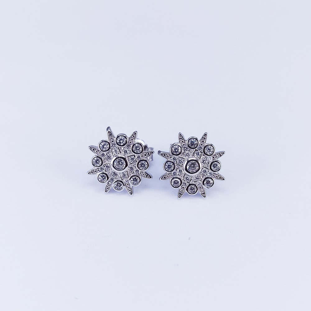 Vintage style floral tops earrings featuring bead setting and bezel setting. Set with cubic zirconia. Rhodium Plated. Genuine Sterling Silver.