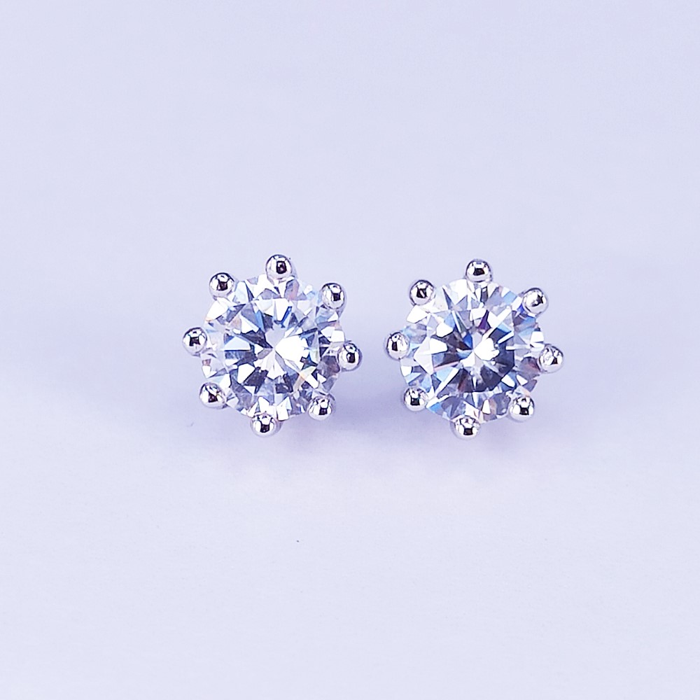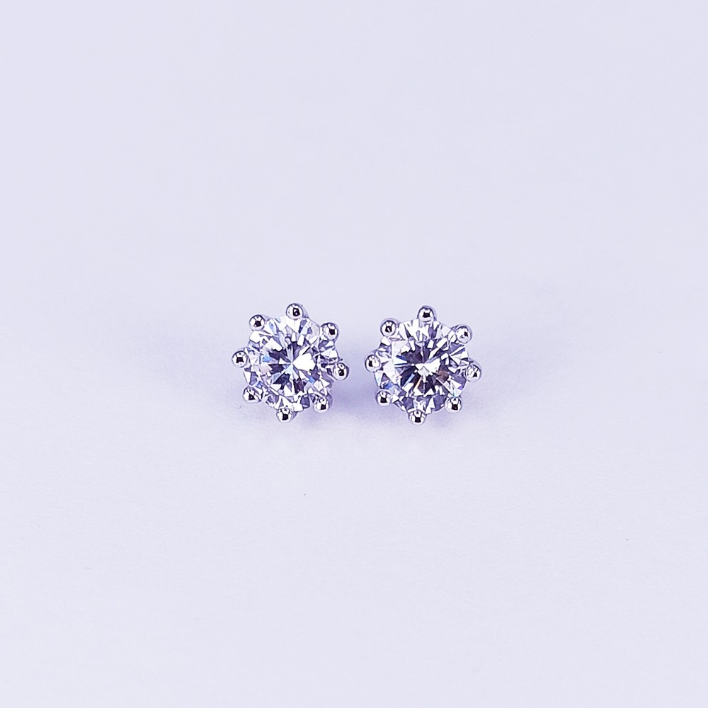 Featuring a Solitaire Cubic Zirconia these stud earrings are of classic design featuring prong setting and push backs. Manufactured in genuine Sterling Silver. Electroplated with Rhodium.