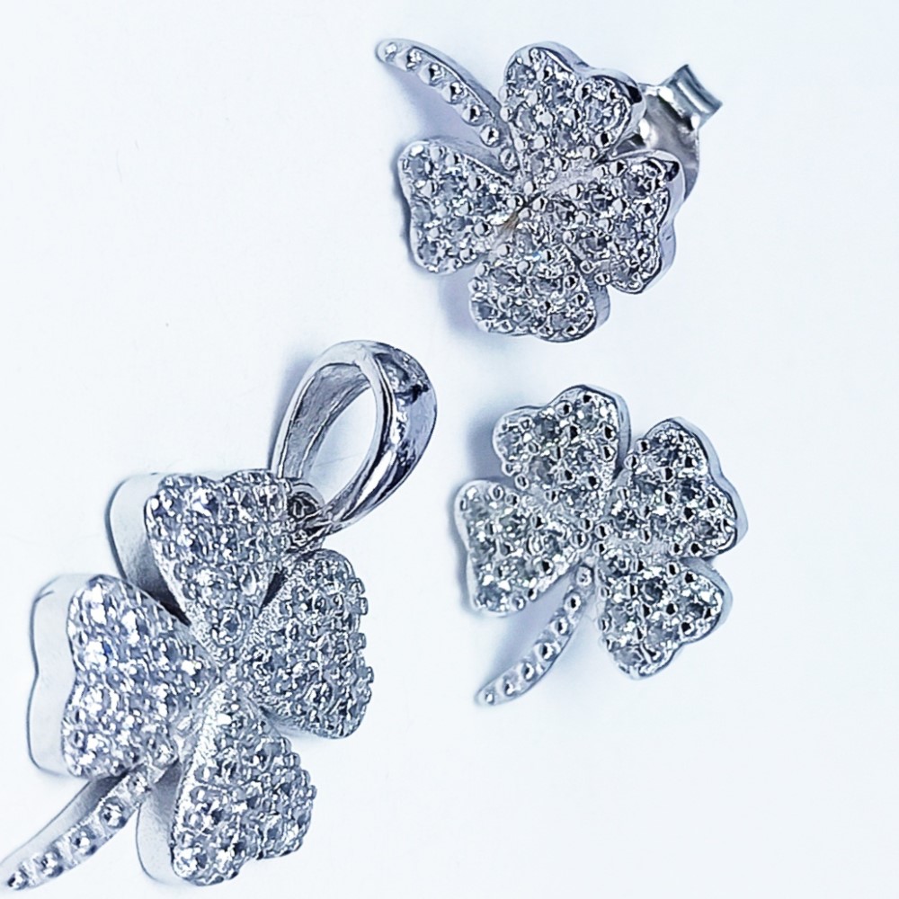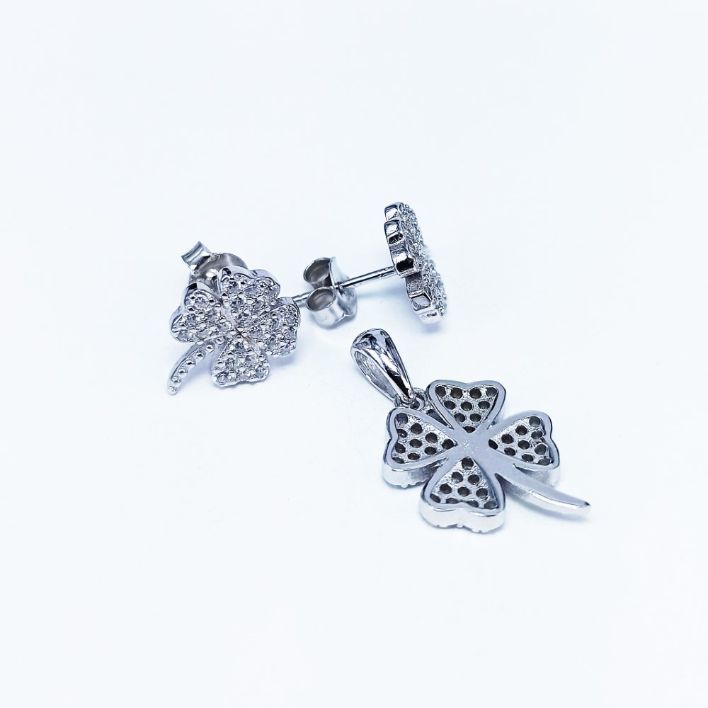 Leaf Shaped Pendant & Earrings set studded with cubic zirconia in Pavé setting style. Manufactured in Genuine 925 Sterling Silver. Rhodium plated for lasting finish.