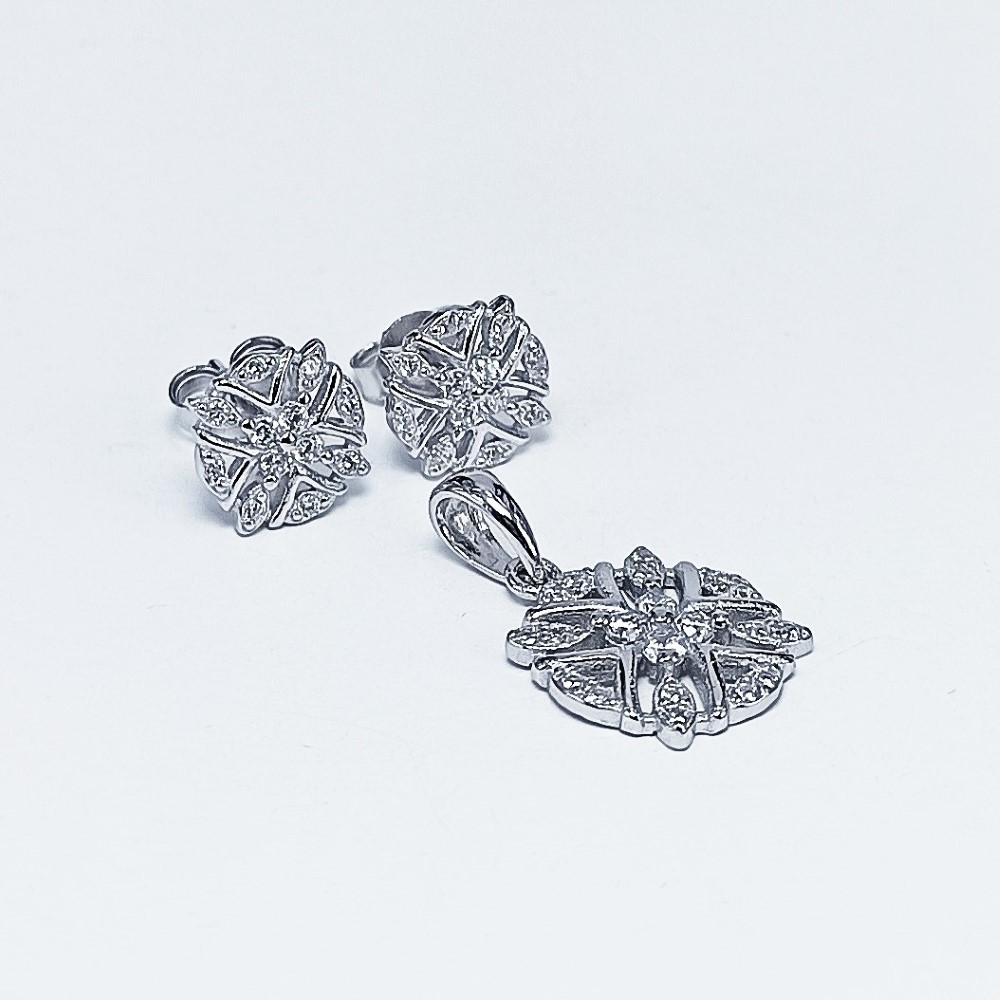 Small sized pendant & earrings tops set studded with cubic zirconia and electroplated with Rhodium for superior lasting shine. Genuine Sterling Silver Guarantee.