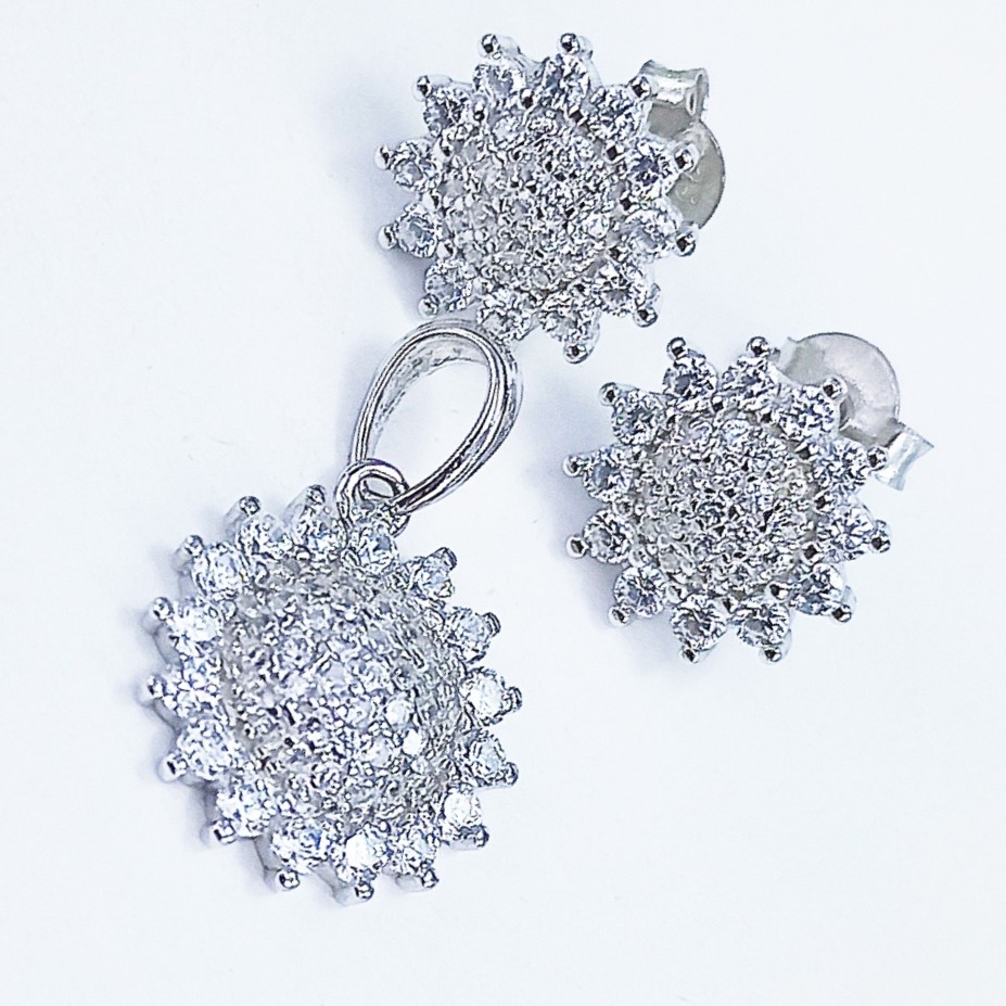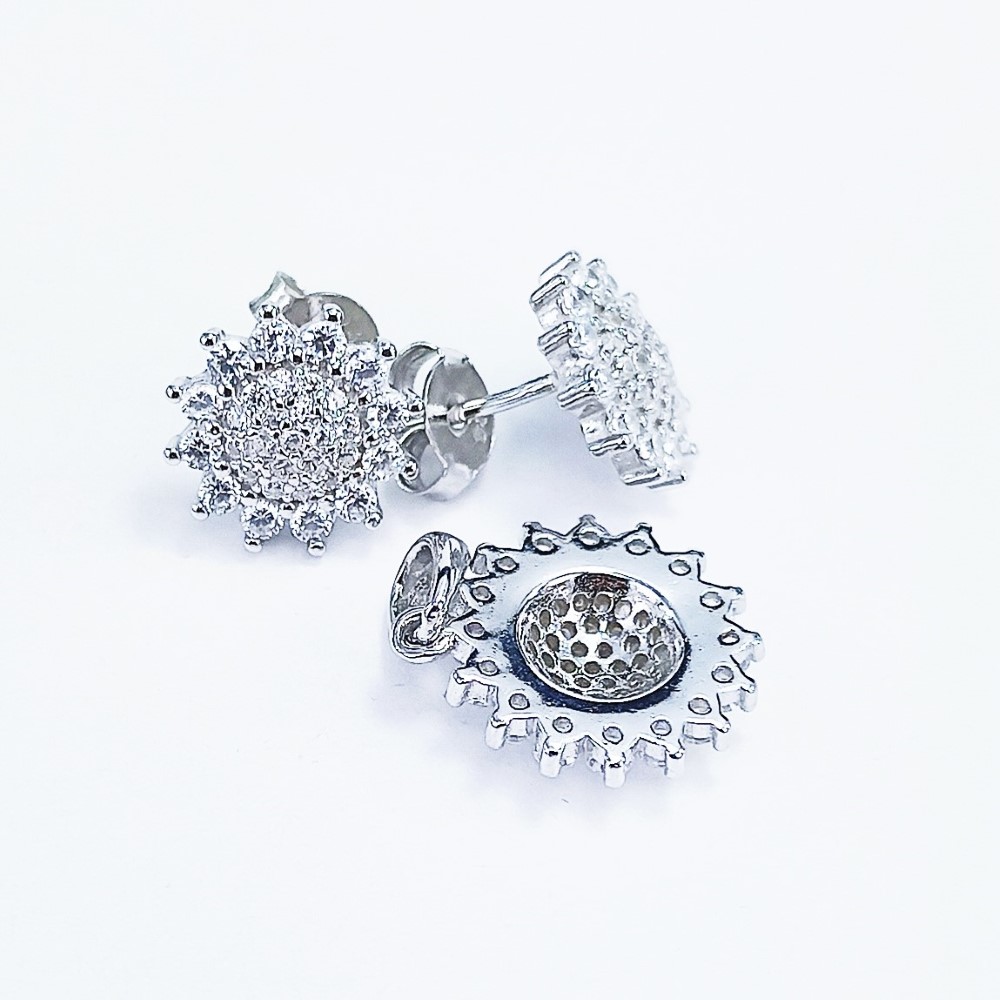 Pendant & Earrings Set in round shape studded with Cubic Zirconia and electroplated with Rhodium. Genuine Sterling Silver.